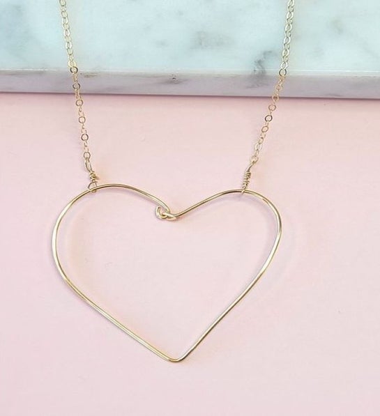 A simple heart pendant necklace in silver. Size: 16" Length, 2" Heart Pendant Hypoallergenic. Handmade with love in Sausalito, California